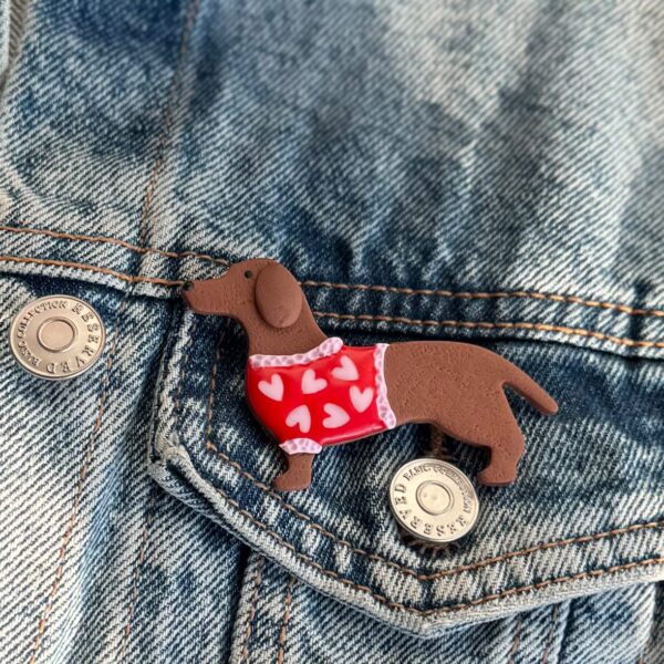 Broszka jamnik w sweterku w serduszka